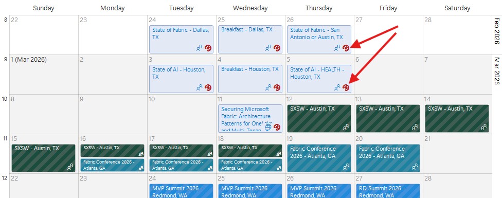 The calendar now shows the location of the event in the displayed text, and an icon that indicates whether the event is online or in-person (or both).