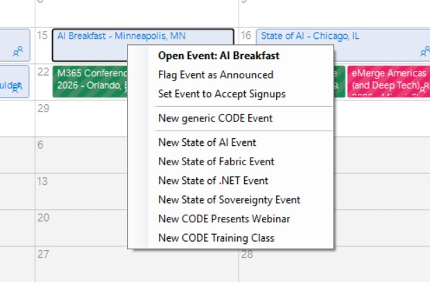 The calendar now features a right-click menu that makes tedious task much faster, such as announcing an event, or creating new events (based on standard brands):