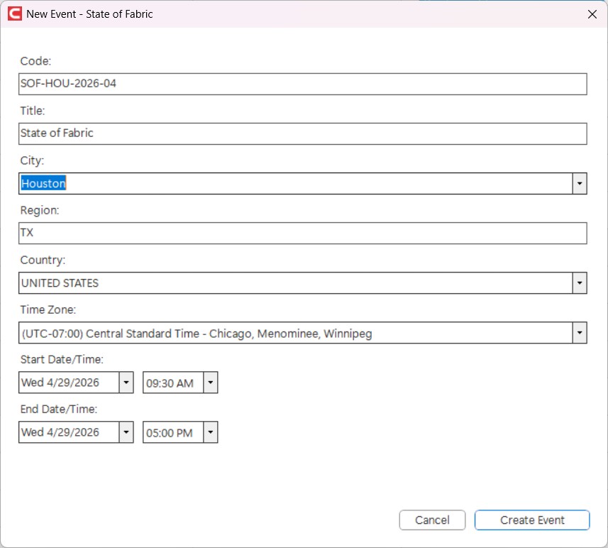 The new quick-create-event dialog allows for the creation of typical events in a painless fashion. Note that this feature is relatively smart in setting reasonable defaults for the standard event brands we usually host: