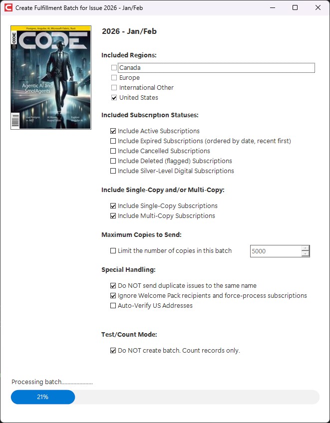 The interface for generating magazine subscription mailing batches has been modernized. The progress indicator has been simplified. The option to fix empty states has been removed, since the system now does that continuously behind the scenes anyway.